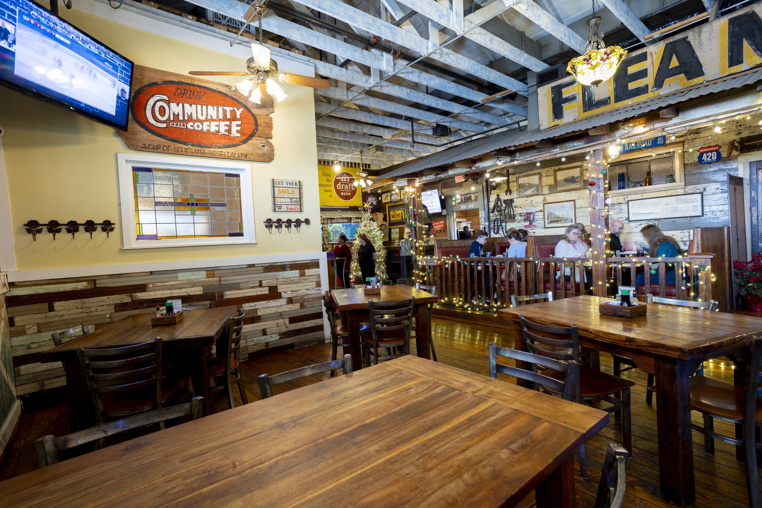 If you are searching for “seafood restaurants near me” or “date-night ideas in Hammond,” Cate Street Seafood Station offers the charm of a historic freight station with cozy, updated vibes. The original wood floors, vintage railroad details, and warm lighting create a relaxed setting that feels special but never stuffy.